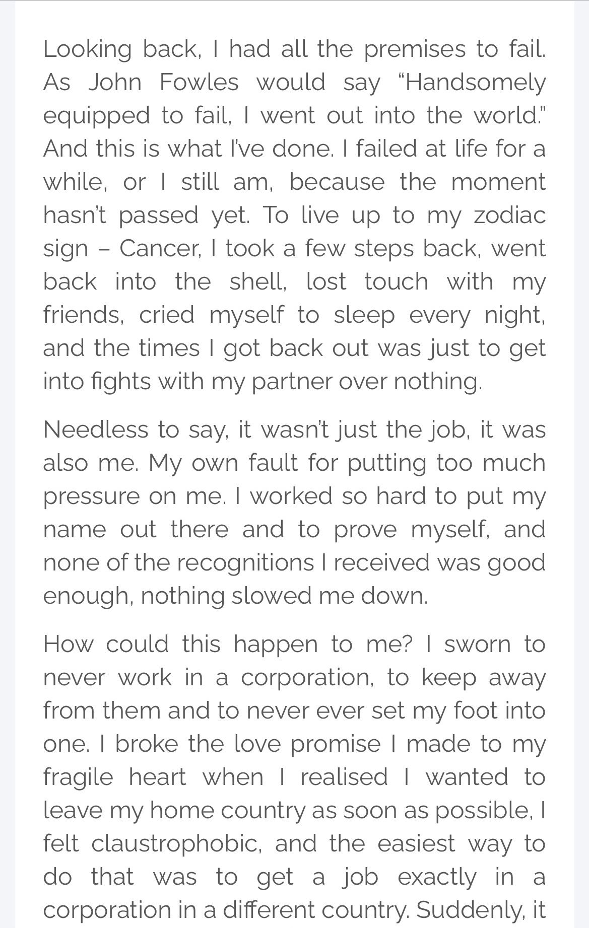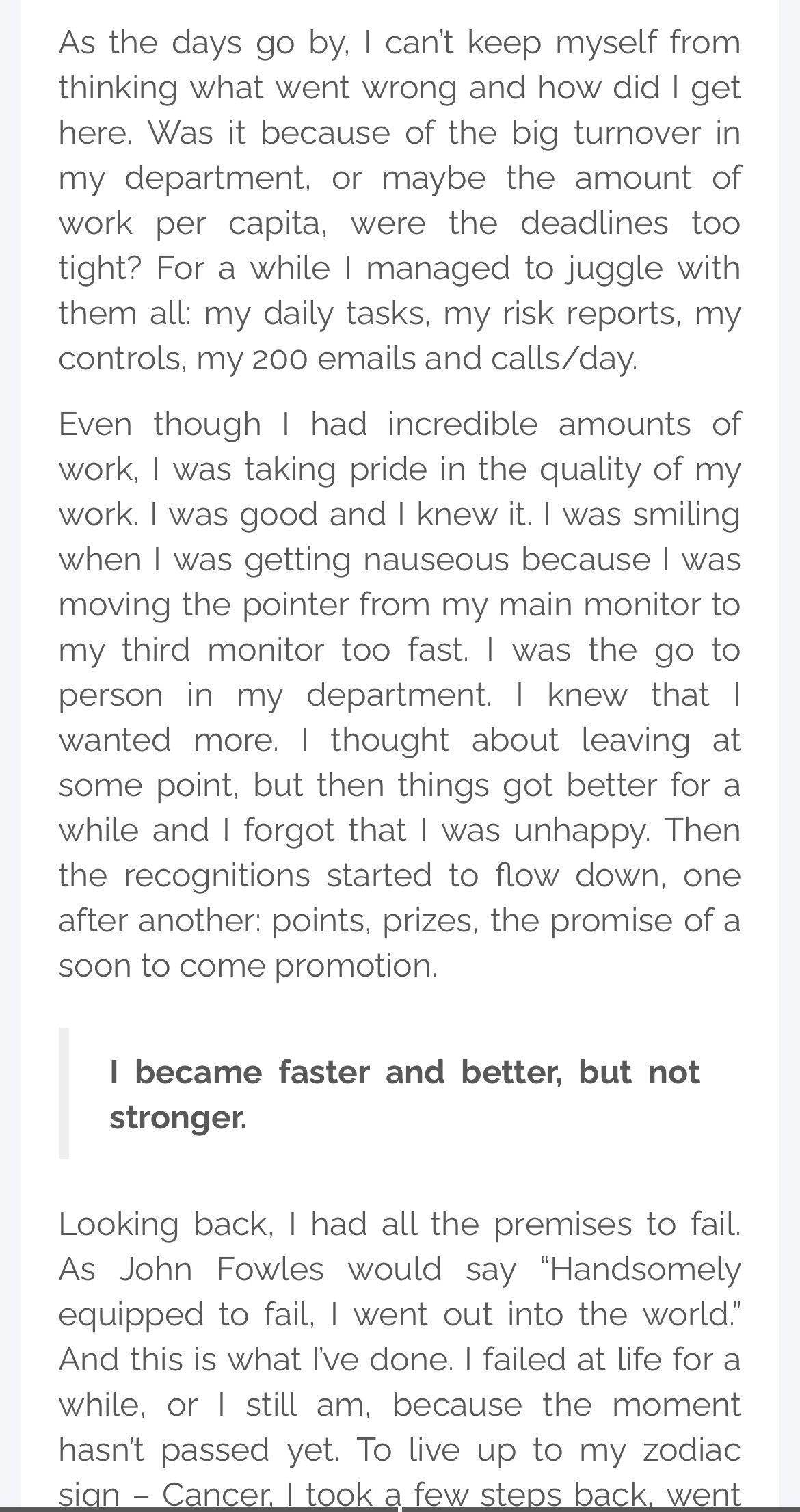 Acum câțiva ani, mă aflam aici. Am scris un articol pentru un site de succes despre burnout. Un burnout pe care nu l-am simțit venind. Practic nu am știut ce m-a lovit. Îmi amintesc cum, la vremea respectivă, tot ce îmi doream este să fac ceva meaningful. Acesta era visul meu.